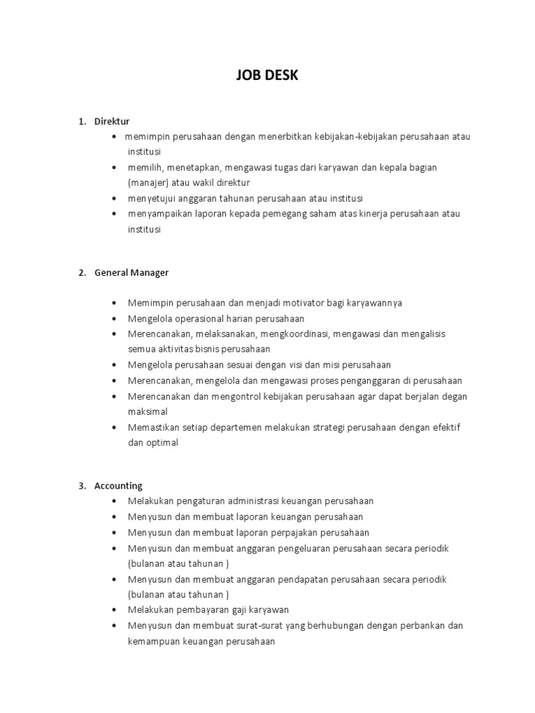 Isi dari rekaman tertulis tersebut adalah seputar tanggung jawab dari pekerjaan tertentu. Waktu masuk = 08.00 wib ( membersihkan toko, membersihkan / mencuci alat, dsb) waktu buka = 10.00 wib 18.00 wib peminjaman : Pengertian job deskripsi (job desc) adalah suatu bagian atau catatan yang menjelaskan dan menggambarkan secara umum mengenai pekerjaan yang akan dilakukan oleh karyawan.fungsi job description adalah untuk menjelaskan bagaimana tanggung jawab, tugas, dan wewenang yang akan karyawan pegang pada sebuah jabatan atau posisi secara garis besar. Titus hervi arianto a g n e s o k ta m a l a m i c k y f r a n j aya job analysis atau analisi jabatan menurut mathis dan jakson analisis jabatan merupakan cara sistematik untuk mengumpulkan dan menganalisis informasi tentang isi dan personal yang dipersyaratkan dalam jabatan, dan dalam hubungannya dengan prestasi jabatan manfaat job. Dengan memberikan informasi mengenai job desk ke karyawan, mereka akan berkontribusi secara maksimal untuk perusahaan.